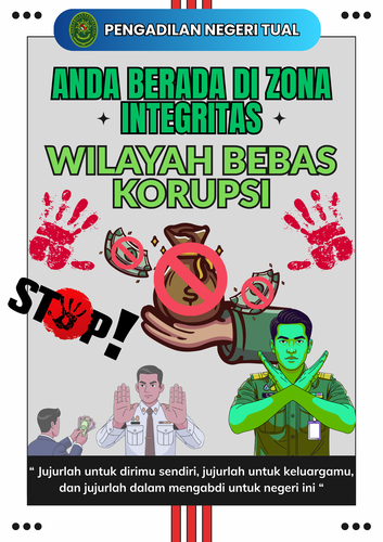 Ketua Pengadilan Negeri, Wakil Ketua Pengadilan Negeri, Hakim, Panitera serta Sekretaris beserta seluruh Jajaran Aparatur Pengadilan Negeri Tual Tidak akan pernah meminta imbalan ataupun melakukan pungutan liar kepada para pencari keadilan.